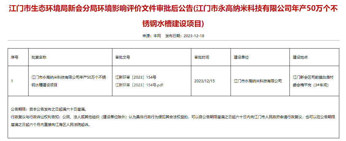 12月18日,江門市生態環境局新會分局就江門市永高納米科技有限公司年產50萬個不銹鋼水槽建設項目環境影響評價文件作出審批意見并對外進行公告,公告期限:自本公告發布之日起滿六十日屆滿。(來源:江門市新會區人民政府)